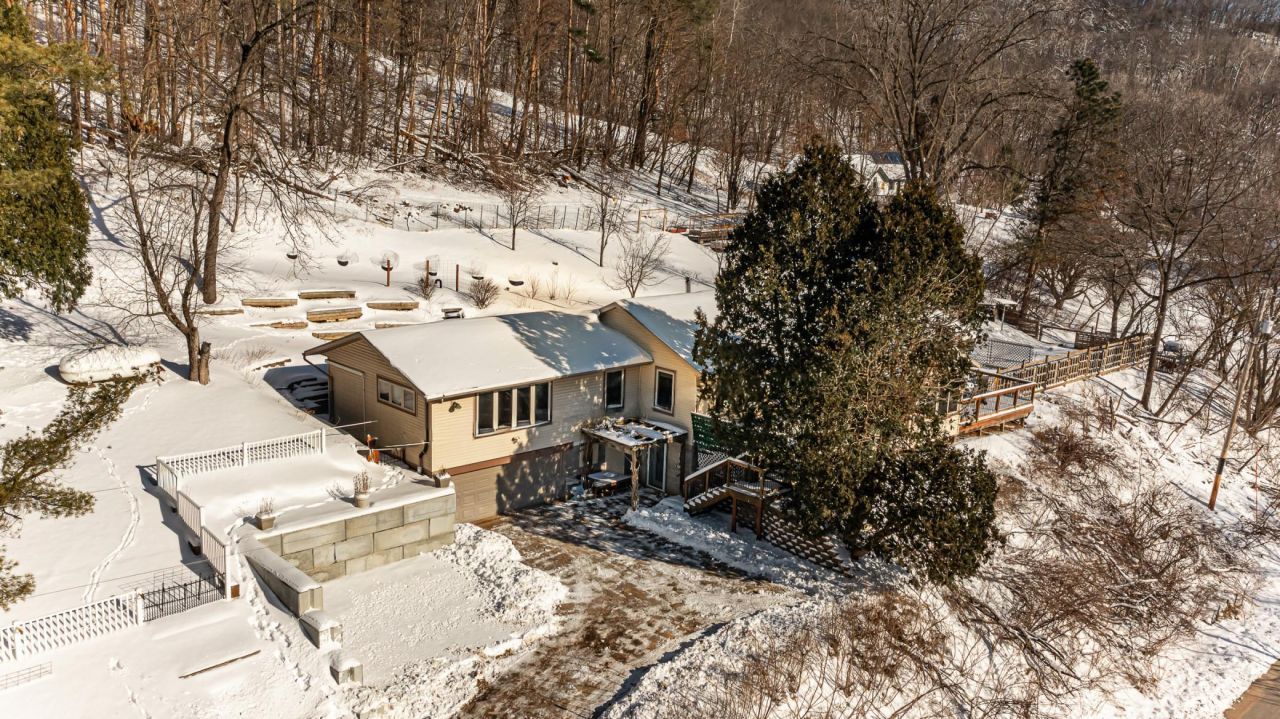 Set among the scenic bluffs, this unique acreage offers remarkable views from multiple vantage points and a setting that captures the beauty of the surrounding landscape. The main level features a spacious primary suite with a large walk-in closet and private full bathroom, along with a second bedroom connected to a convenient pass-through full bathroom. The living room features a cozy wood stove, creating a warm and inviting gathering space, while the sunroom provides a bright place to relax and take in the sweeping bluff views. A large kitchen and dining area offer plenty of space for everyday living and entertaining, and an additional bonus room provides flexibility to tailor the space to your needs. Two spacious decks extend the living area outdoors and overlook the stunning scenery. The walkout lower level includes a family room, a 3/4 bathroom, and a bonus room without an egress window that may serve well as an office, hobby room, or additional flexible space. With its versatile layout and unforgettable views, this property presents a rare opportunity to enjoy peaceful bluff country living.