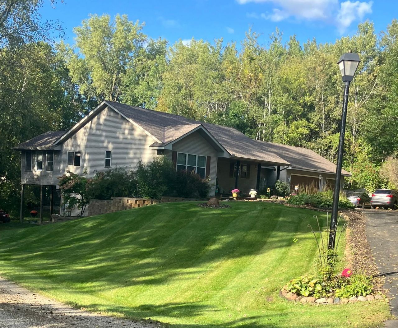 Discover this beautifully refreshed walk-out rambler, perfectly situated on 2.50private acres. From the moment you enter, you'll be greeted by stunning real 100 yearold pine wood floors, and an expansive open floor plan. The gourmet kitchen is achef's dream, featuring a massive center island with a built-in cooktop, double oven/microwave and a striking copper sink. The first floor laundry room has been redone,andthe main level freshly painted. Retreat to the luxurious primary suite, complete witha spa-like ceramic walk-in shower and a generous walk-in closet.The main level features a cozy family room with a gas fireplace, while the finishedlower level offers two additional bedrooms, a spacious recreation room, and a fullbath. Outside, enjoy professionally manicured landscaping and incredible storage: anattached three-car garage plus a separate, oversized two-car garage that is fullyinsulated and heated.Deck has been recently restained as well. This rare find is amust-see!